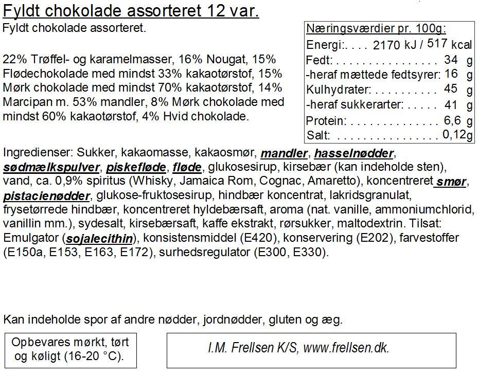 Gaveæske med 12 stykker fyldt chokolade. Æsken indeholder et varieret udvalg af fyldt chokolade.