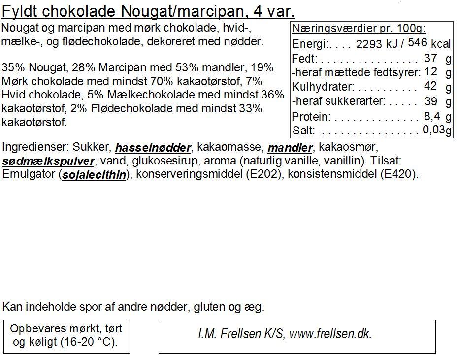 Gaveæske med nougat/marcipan stykker. Stykkerne indeholder ikke alkohol. 3 stk. Nougat med hvid chokolade, 3 stk. Nougat, 3 stk. Marcipan Nougat og 3 stk. Marcipan.