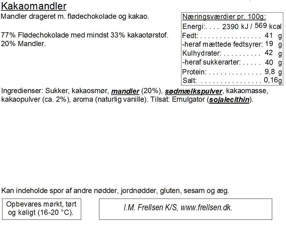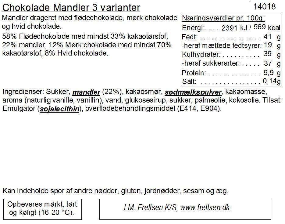 Mandler drageret med flødechokolade, mørk chokolade og hvid chokolade pakket i spidspose.