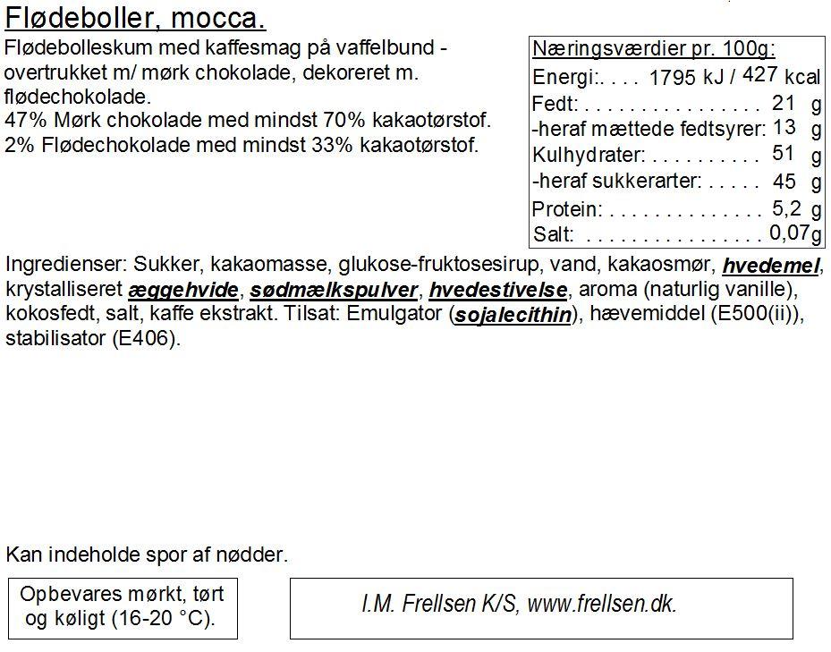 Flødebolleskum med moccasmag på vaffelbund overtrukket med mørk chokolade.