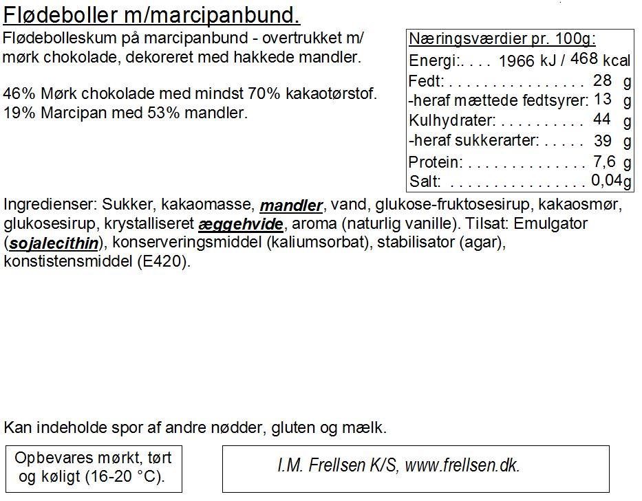 Flødebolleskum på marcipanbund overtrukket med mørk chokolade.