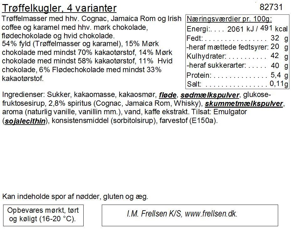 Gaveæske med assorterede trøffelkugler. Indeholder 3 stk. Jamaica Rom, 3 stk. Cognac, 3 stk. Irish Coffee og 3 stk. Karamel.